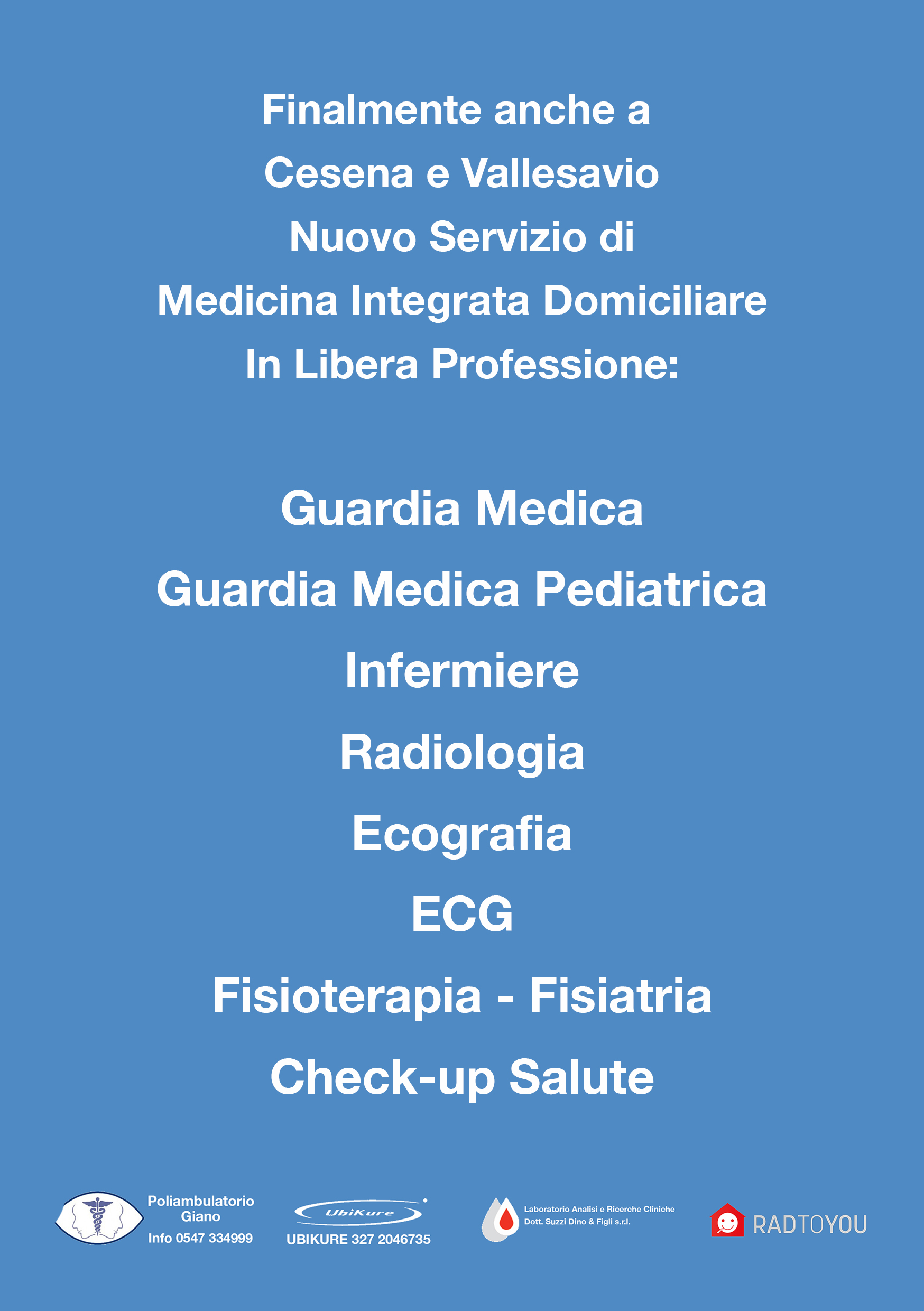 Ubikure ( prestazioni ifermieristiche professionali ), Radiologia-Domiciliare (servizio di diagnostica per immagini Eco ed RX ) e Laboratorio Analisi Suzzi,